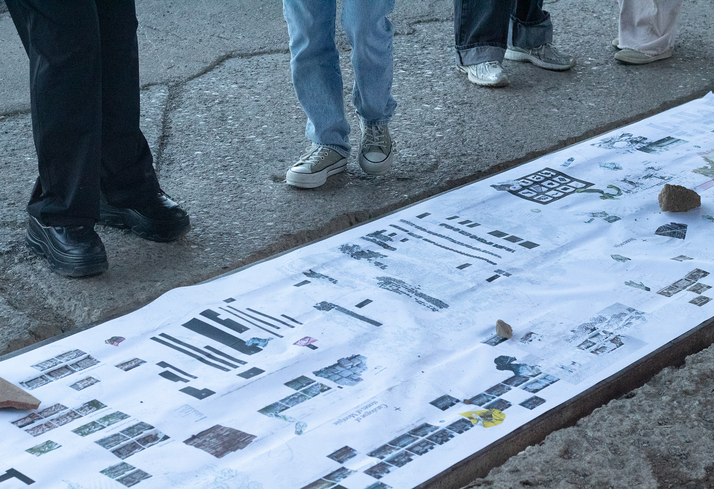 Placing the 14-meter roll along the threshold was a way to once again emphasize the multiple layers of meaning and possibility contained there. It also served as a literal and symbolic means of accessing the site; positioned at the entrance, the scroll demanded to be looked at and stepped on in order to reach the actual location.