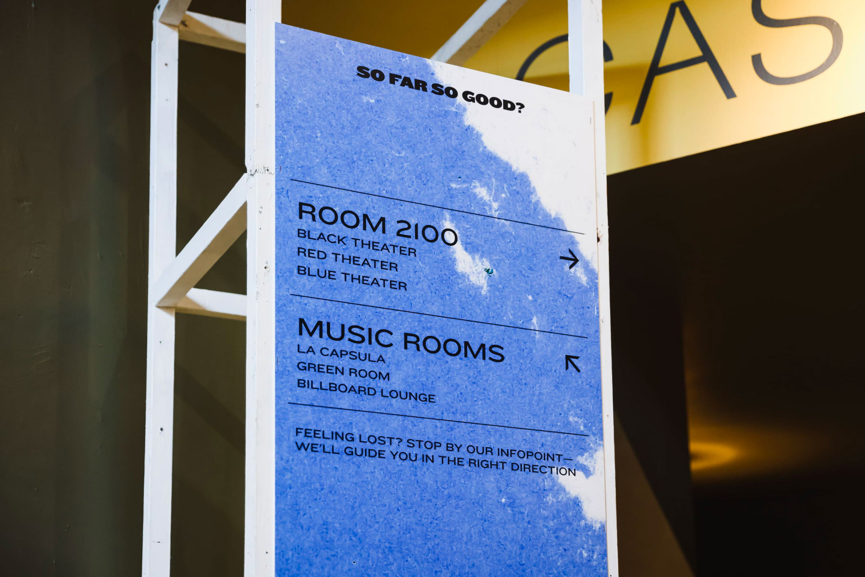 I designed the festival’s on-site communication together with the production team. Practical information signage was placed on vertical panels, guiding visitors during the day with balck text on the blue sky.