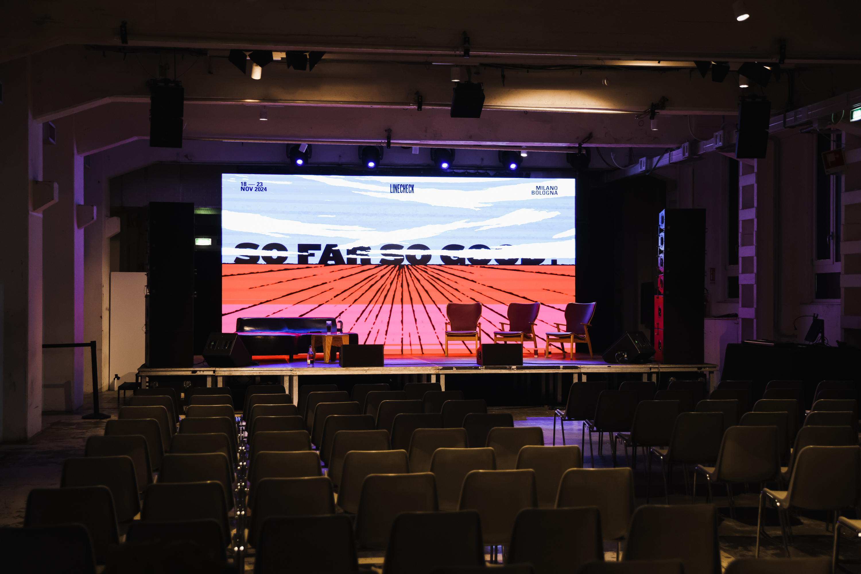 A series of animated graphics were developed for screens in venue, including a red-on-black horizon backdrop for the closing night sets in Bologna (photo on the top, Ph: @richardgiorio).